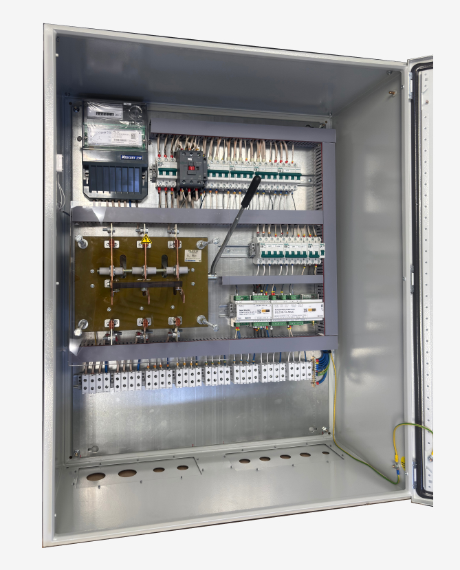 DIGICITY DC200.T3.MGE.ExM4 – 64 точки контроля, 15 отходящих групп, 3 канала управления, 3 датчика контроля тока, габариты шкафа 400*400*170 мм.