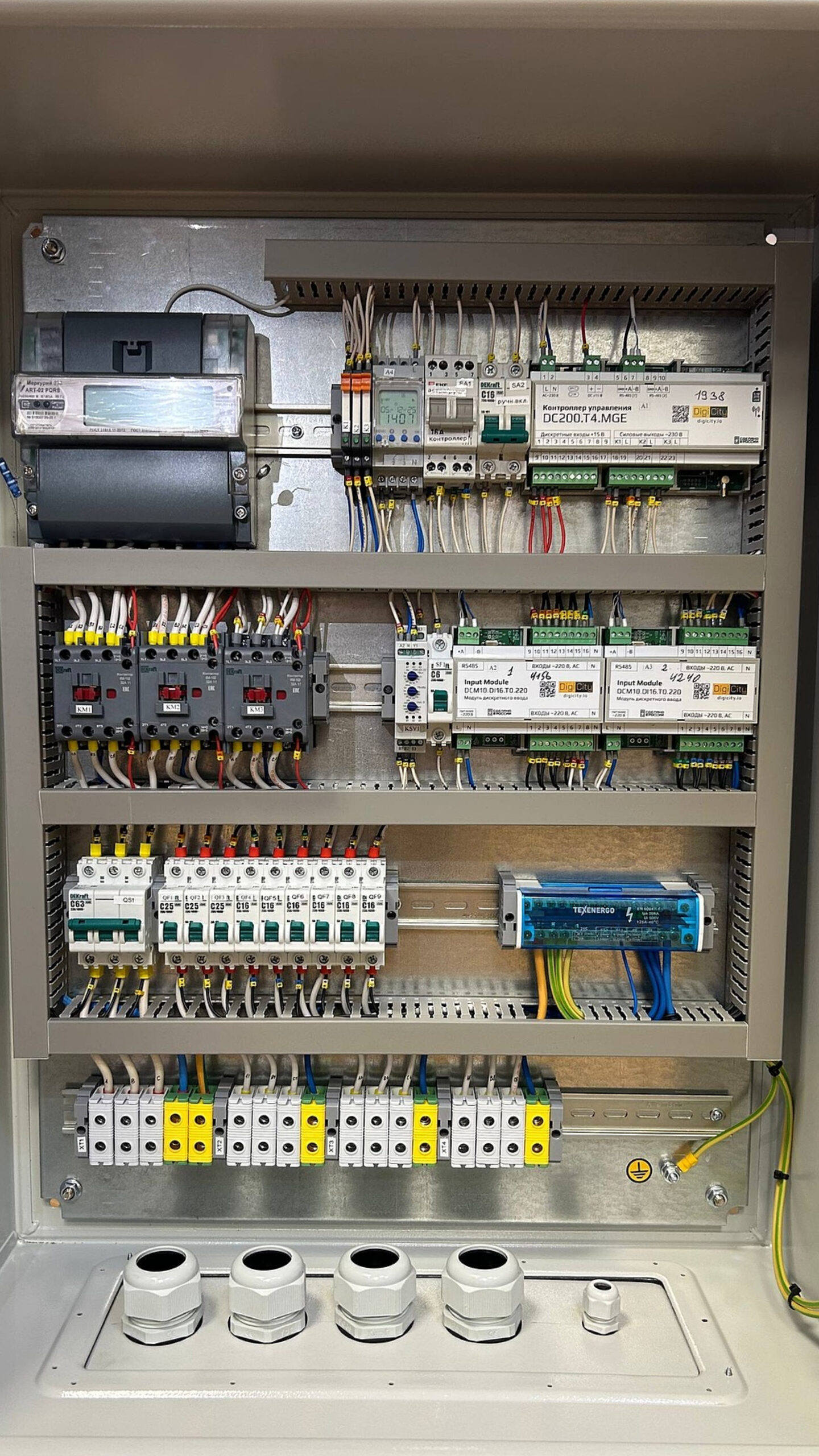 DIGICITY DC200.T3.MGE.ExM3 – 48 точек контроля, 9 отходящих групп, 3 канала управления, 3 датчика контроля тока, габариты шкафа 400*400*170 мм.